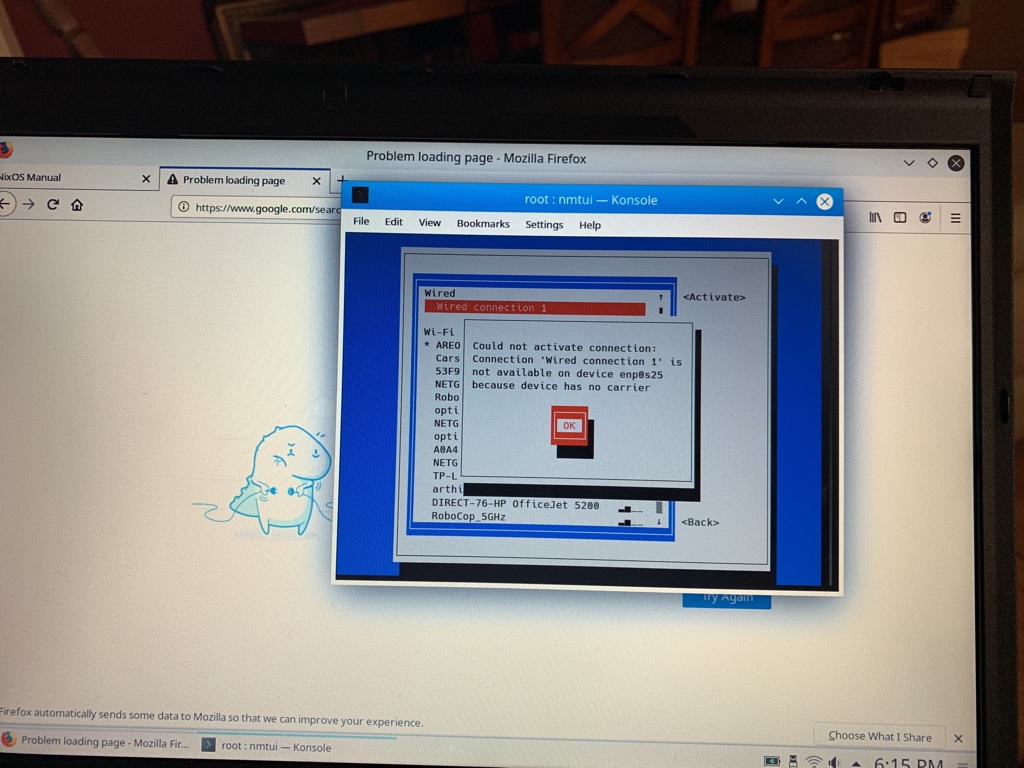 snags I ran into -- and again, this may be due to personal failings, it'd be a non-problem if each time I tried to go all-in instaed of going this traditional path I mentioned of either nix on host-system or in a vm before doing that