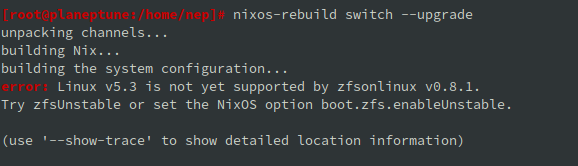 may anyone help me pls ? i successfully installed nix yesterday on my pc. then i booted it and made an upgrade like it was described in the manual ... now i get an error msg when i nixos-rebuild switch for /nix/var/nix/profiles/per-user/root/channels/nixos/lib/modules.nix